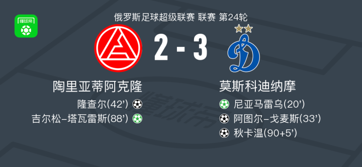 北京时间4月13日俄罗斯足球超级联赛 联赛 第24轮,陶里亚蒂阿克隆主场对阵莫斯科迪纳摩。陶里亚蒂阿克隆隆查尔破门,吉尔松-塔瓦雷斯破门。莫斯科迪纳摩尼亚马雷乌破门,阿图尔-戈麦斯破门,秋卡温破门。最终比分陶里亚蒂阿克隆 2-3 莫斯科迪纳摩。