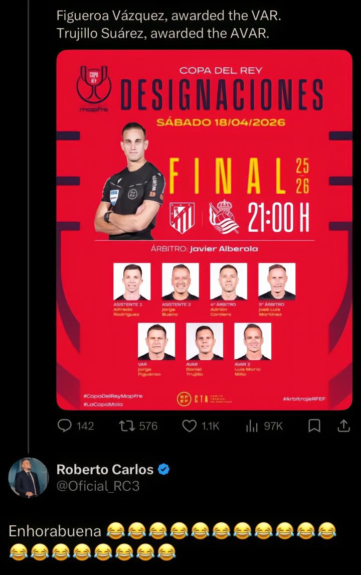 北京时间4月14日,皇马球星罗伯托-卡洛斯在社交媒体上用一句“恭喜啊”配以连续笑哭表情,讽刺西班牙足协任命阿尔贝罗拉-罗哈斯执法国王杯决赛。