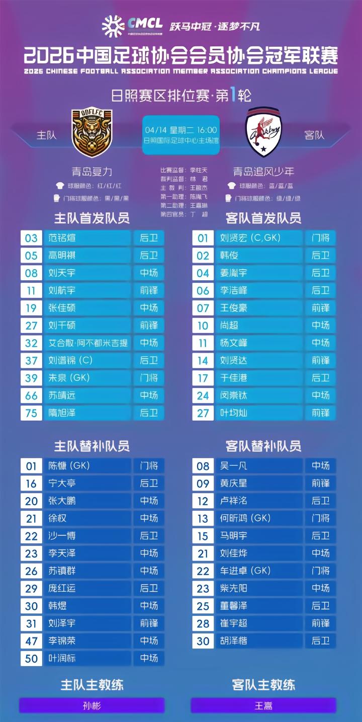 青岛追风少年方面,主教练王嵩安排守门员刘贤宏担任场上队长,韩俊、姜胤宇、李浩峰、王俊豪、尚超、杨文峰、刘贤达、于佳港、闵崇钛、叶均灿同时首发。