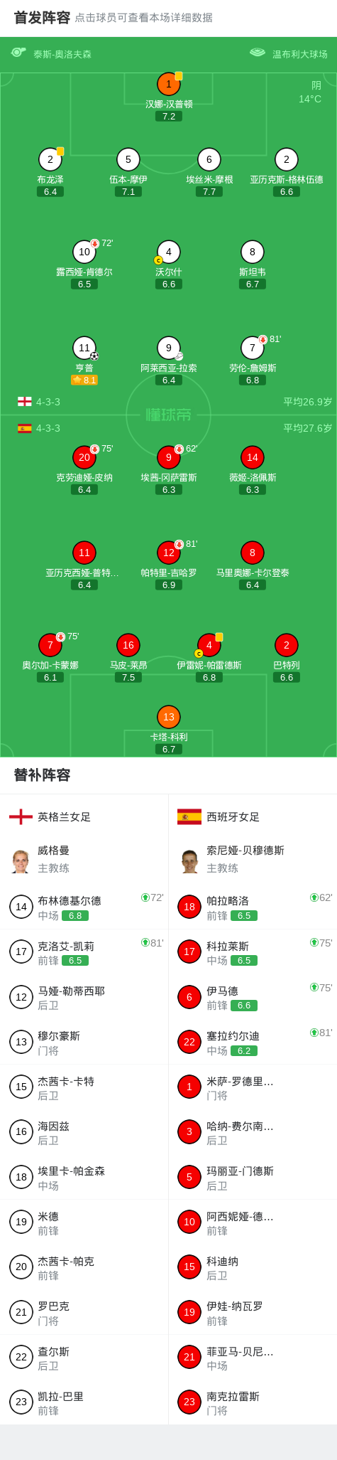 英格兰女足1-0西班牙女足,亨普制胜战报bot @懂球帝04-15 03:53北京时间4月15日世界杯女子欧洲预选赛 A联赛,英格兰女足对阵西班牙女足。英格兰女足亨普破门。最终比分英格兰女足 1-0 西班牙女足。点击查看本场比赛详细数据>>点击查看世女欧预完整积分榜>>精彩瞬间第3分钟,英格兰女足球员阿莱西亚-拉索助攻亨普打入一球。 球队阵容 技术统计 展开更多
