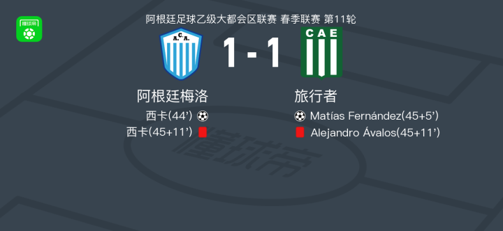 北京时间4月15日阿根廷足球乙级大都会区联赛 春季联赛 第11轮,阿根廷梅洛主场对阵旅行者。阿根廷梅洛西卡破门。旅行者Matías Fernández破门。最终比分阿根廷梅洛 1-1 旅行者。