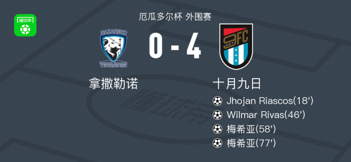 北京时间4月15日厄瓜多尔杯 外围赛,拿撒勒诺对阵十月九日。十月九日Jhojan Riascos破门,Wilmar Rivas破门,梅希亚梅开二度。最终比分拿撒勒诺 0-4 十月九日。