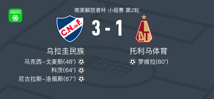 北京时间4月15日南美解放者杯 小组赛 第2轮,乌拉圭民族对阵托利马体育。乌拉圭民族马克西-戈麦斯破门,科茨破门,尼古拉斯-洛佩斯破门。托利马体育罗维拉破门。最终比分乌拉圭民族 3-1 托利马体育。