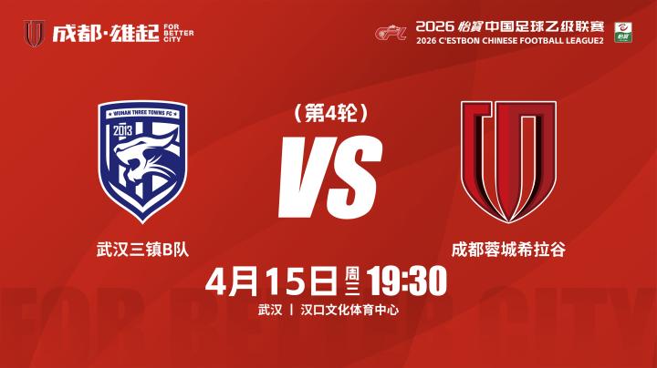 中乙联赛 比赛日 武汉三镇B队 vs 成都蓉城希拉谷成都蓉城足球俱乐部 @懂球帝04-15 09:14中乙联赛 比赛日 2026怡宝中国足球乙级联赛 第4轮 ⚽ 武汉三镇B队 vs 成都蓉城希拉谷 📅 4月15日(周三)19:30 🥅 汉口文化体育中心 📺 抖音-中乙联赛、APP-咪咕视频、足球频道(APP+小程序)、雷速体育、直播吧、微信公众号-江苏体育休闲频道展开更多