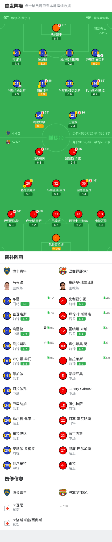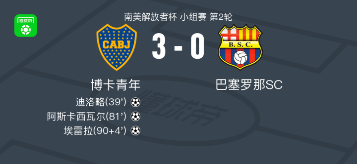 北京时间4月15日南美解放者杯 小组赛 第2轮,博卡青年对阵巴塞罗那SC。博卡青年迪洛略破门,阿斯卡西瓦尔破门,埃雷拉破门。最终比分博卡青年 3-0 巴塞罗那SC。