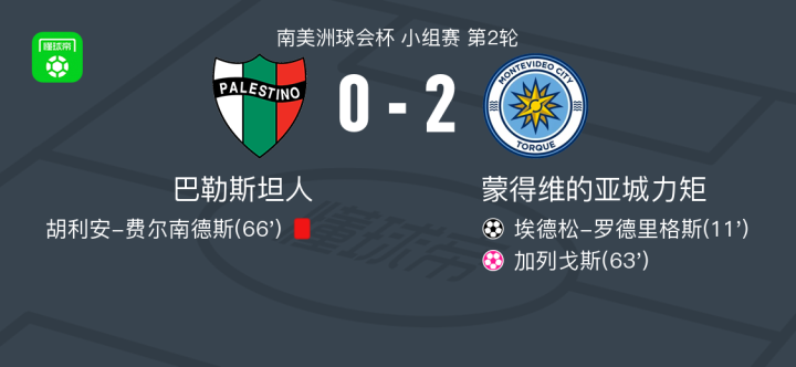 北京时间4月15日南美洲球会杯 小组赛 第2轮,巴勒斯坦人对阵蒙得维的亚城力矩。巴勒斯坦人加列戈斯自摆乌龙。蒙得维的亚城力矩埃德松-罗德里格斯破门。最终比分巴勒斯坦人 0-2 蒙得维的亚城力矩。