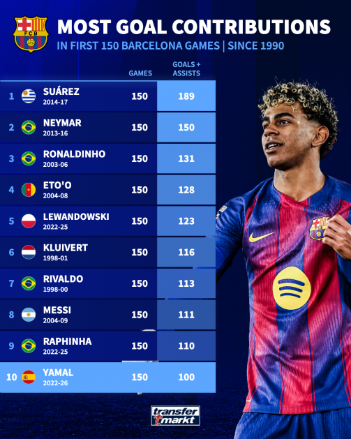同时,在巴萨前150场进球参与最多的球员榜单中,亚马尔也跻身历史前十。