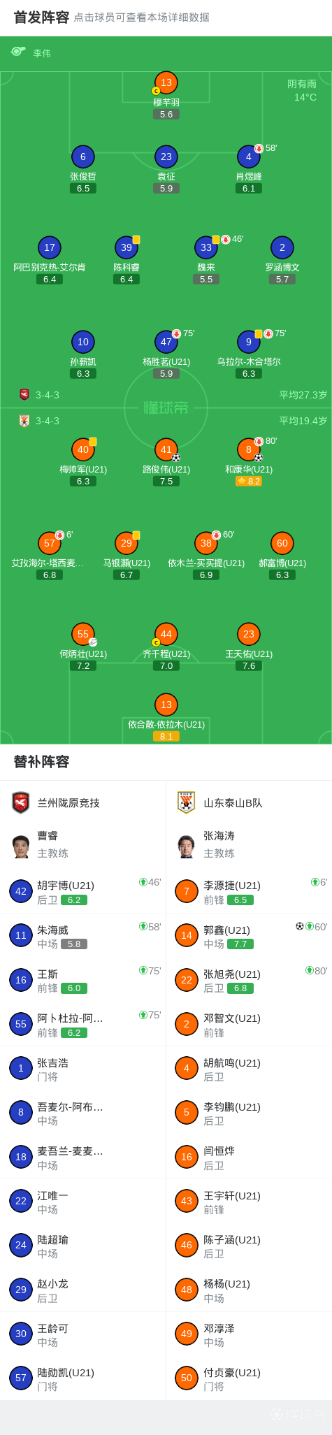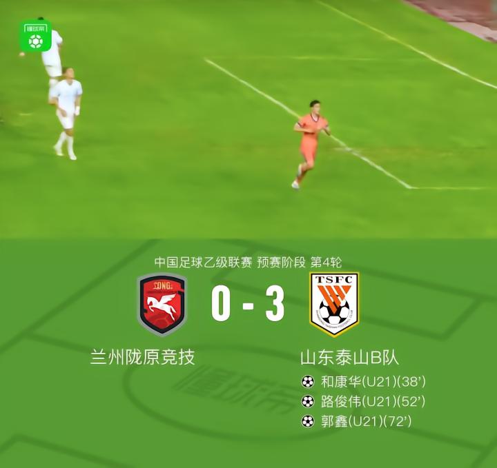 兰州陇原竞技0-3山东泰山B队,和康华破门,郭鑫锁定胜局