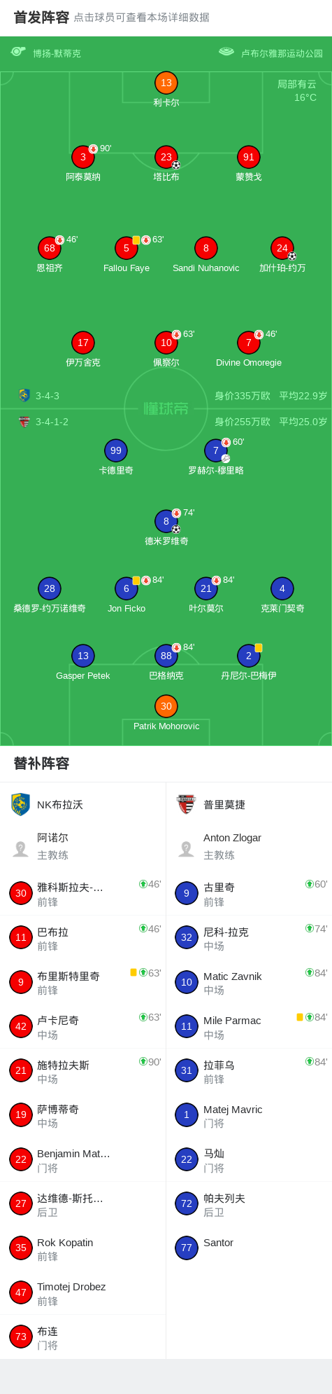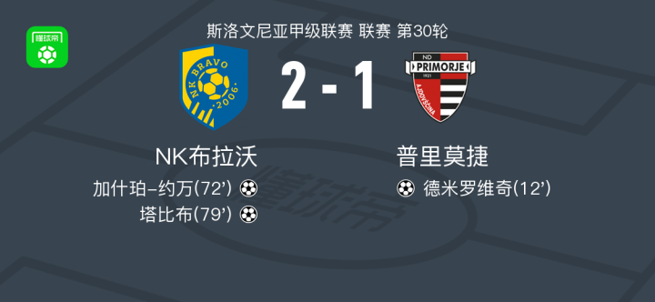 北京时间4月15日斯洛文尼亚甲级联赛 联赛 第30轮,NK布拉沃主场对阵普里莫捷。NK布拉沃加什珀-约万破门,塔比布破门。普里莫捷德米罗维奇破门。最终比分NK布拉沃 2-1 普里莫捷。