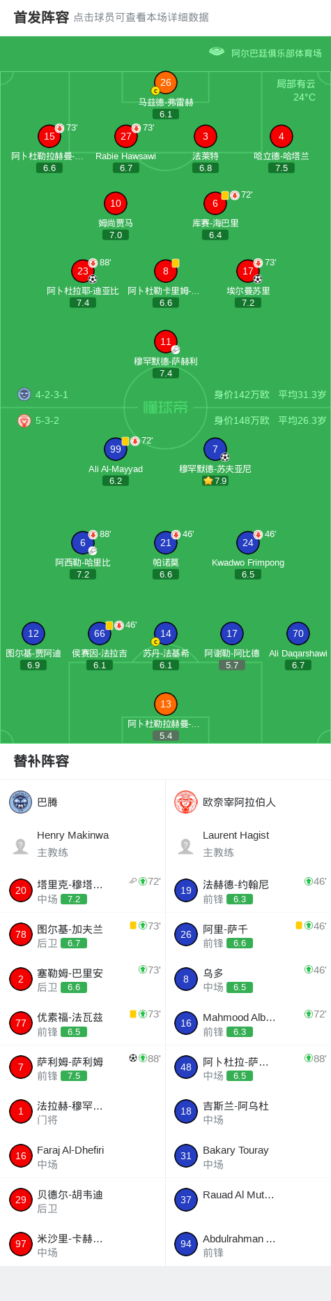 下半场补时第7分钟,巴腾球员塔里克-穆塔伊里助攻萨利姆-萨利姆打入一球。