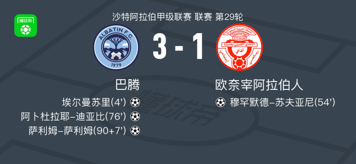 北京时间4月16日沙特阿拉伯甲级联赛 联赛 第29轮,巴腾主场对阵欧奈宰阿拉伯人。巴腾埃尔曼苏里破门,阿卜杜拉耶-迪亚比破门,萨利姆-萨利姆破门。欧奈宰阿拉伯人穆罕默德-苏夫亚尼破门。最终比分巴坦 3-1 欧奈宰阿拉伯人。