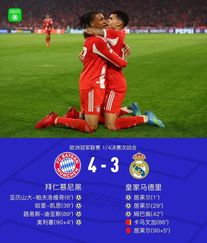 XbotGo丨拜仁总分6-4皇马晋级4强,迪亚斯破门,卡马文加染红