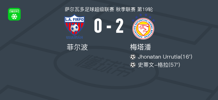 北京时间4月16日萨尔瓦多足球超级联赛 秋季联赛 第19轮,菲尔波主场对阵梅塔潘。梅塔潘Jhonatan Urrutia破门,史蒂文-格拉破门。最终比分菲尔波 0-2 梅塔潘。