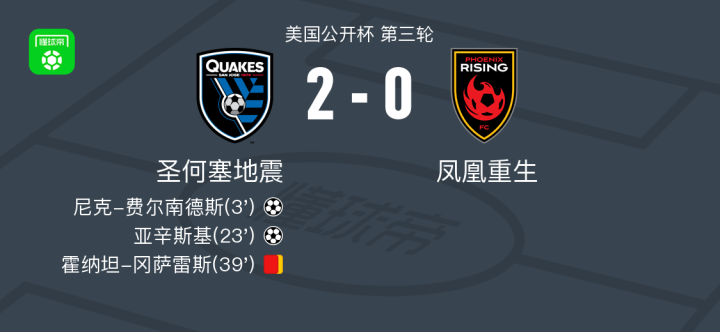 北京时间4月16日美国公开杯 第三轮,圣何塞地震对阵凤凰重生。圣何塞地震尼克-费尔南德斯破门,亚辛斯基破门。最终比分圣何塞地震 2-0 凤凰重生。