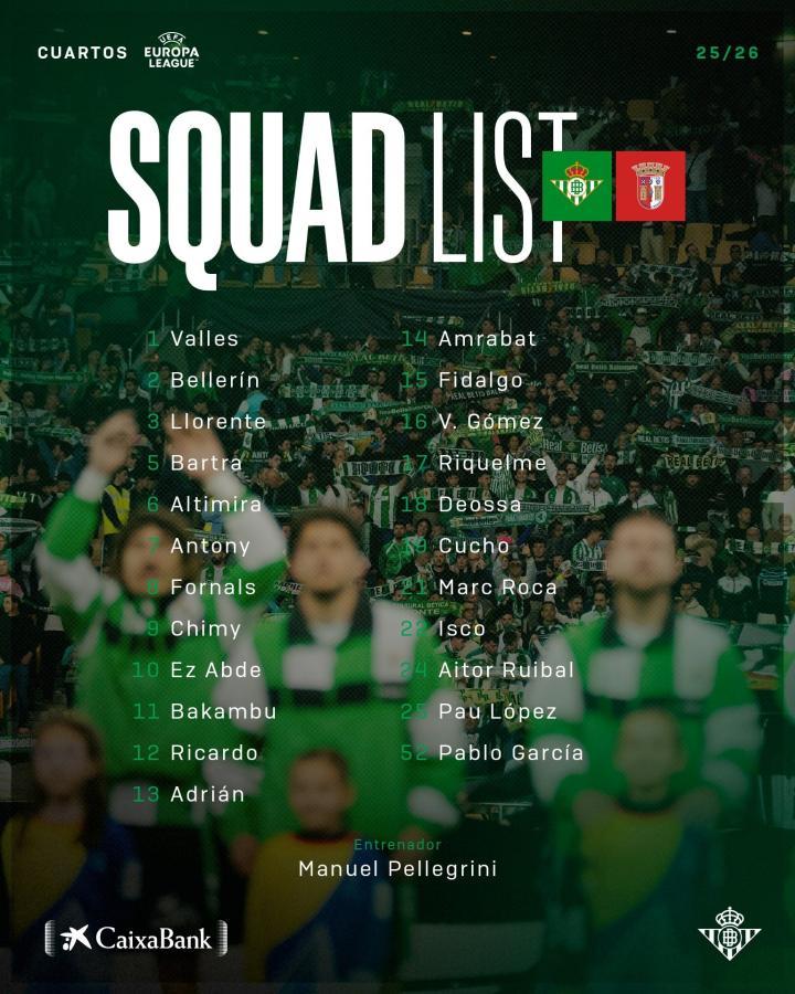 北京时间4月15日晚间,皇家贝蒂斯官方公布了欧联杯1/4角色次回合主场对阵布拉加比赛的大名单。