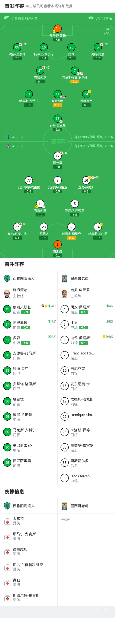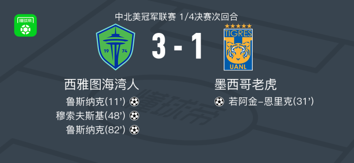 北京时间4月16日中北美冠军联赛 1/4决赛次回合,西雅图海湾人对阵墨西哥老虎。西雅图海湾人鲁斯纳克梅开二度,穆索夫斯基破门。墨西哥老虎若阿金-恩里克破门。双方两回合总比分西雅图海湾人3-3墨西哥老虎,墨西哥老虎凭借客场进球优势晋级。