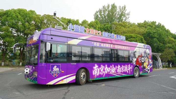 南京公交“苏超号”战车以南京队队徽亮眼的紫色为主色调,紫色背景寓意紫气东来,尽显六朝古都的尊贵与神秘,颜值直接拉满。