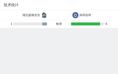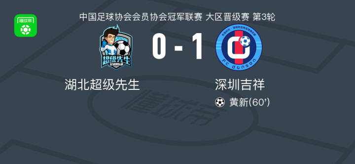 深圳吉祥1-0湖北超级先生,黄新一锤定音战报bot @懂球帝04-16 18:08北京时间4月16日中国足球协会会员协会冠军联赛 大区晋级赛 第3轮,湖北超级先生主场对阵深圳吉祥。深圳吉祥黄新破门。最终比分湖北超级先生 0-1 深圳吉祥。点击查看本场比赛详细数据>>点击查看中冠完整积分榜>>精彩瞬间第60分钟,深圳吉祥球员黄新打入一球。 技术统计 展开更多