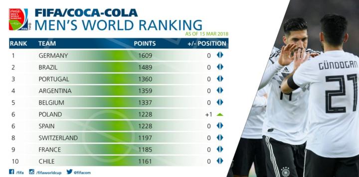 在本期世界排名中,前十没有变化,德国、巴西、葡萄牙、阿根廷、比利时位列前五,波兰和西班牙并列第6,瑞士、法国和智利紧随其后。