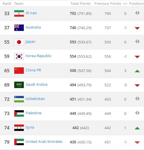 FIFA世界排名:国足上升3位,列世界第65,亚洲第5