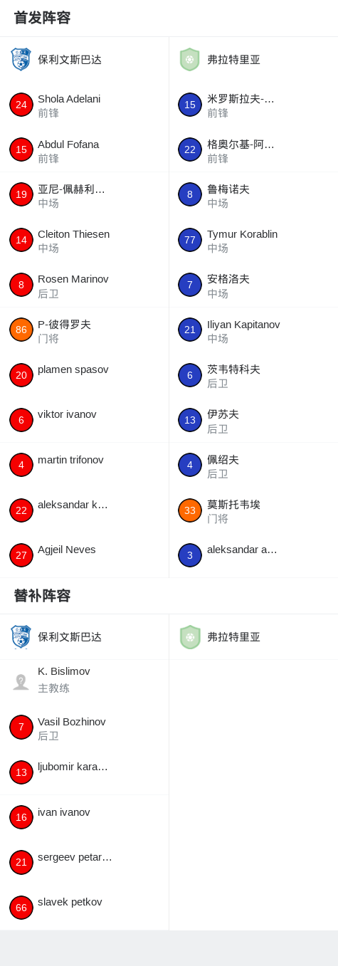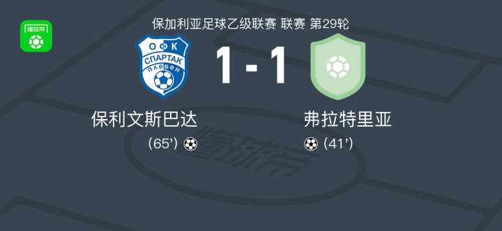 保利文斯巴达1-1弗拉特里亚战报bot @懂球帝04-16 23:52北京时间4月16日保加利亚足球乙级联赛 联赛 第29轮,保利文斯巴达主场对阵弗拉特里亚。最终比分保利文斯巴达 1-1 弗拉特里亚。点击查看本场比赛详细数据>>精彩瞬间第41分钟,弗拉特里亚球员打入一球。第65分钟,保利文斯巴达球员打入一球。 球队阵容 技术统计 展开更多