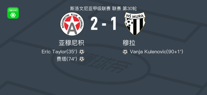 北京时间4月16日斯洛文尼亚甲级联赛 联赛 第30轮,亚穆尼积主场对阵穆拉。亚穆尼积Eric Taylor破门,费塔破门。穆拉Vanja Kulenovic破门。最终比分亚穆尼积 2-1 穆拉。