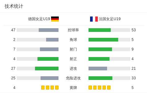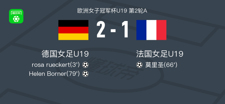 北京时间4月16日欧洲女子冠军杯U19 第2轮A,德国女足U19对阵法国女足U19。德国女足U19rosa rueckert破门,Helen Borner破门。法国女足U19莫里圣破门。最终比分德国女足U19 2-1 法国女足U19。