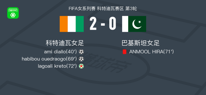 北京时间4月17日FIFA女系列赛 科特迪瓦赛区 第3轮,科特迪瓦女足对阵巴基斯坦女足。科特迪瓦女足ami diallo破门,habibou ouedraogo破门。最终比分科特迪瓦女足 2-0 巴基斯坦女足。