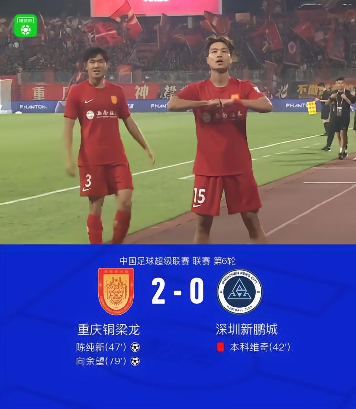 北京时间4月17日中国足球超级联赛第6轮,重庆铜梁龙主场对阵深圳新鹏城。陈纯新、向余望分别破门,本科维奇染红。最终比分重庆铜梁龙2-0深圳新鹏城。