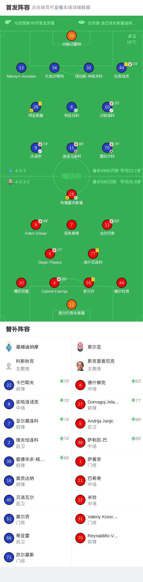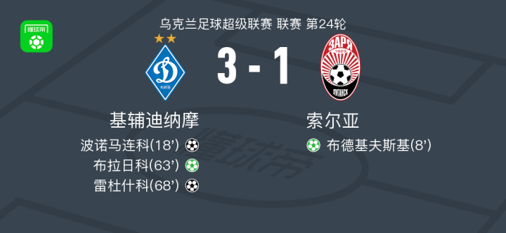 北京时间4月17日乌克兰足球超级联赛 联赛 第24轮,基辅迪纳摩主场对阵索尔亚。基辅迪纳摩波诺马连科破门,雷杜什科破门,布拉日科破门。索尔亚布德基夫斯基破门。最终比分基辅迪纳摩 3-1 索尔亚。