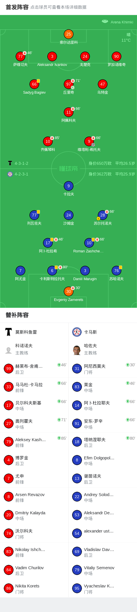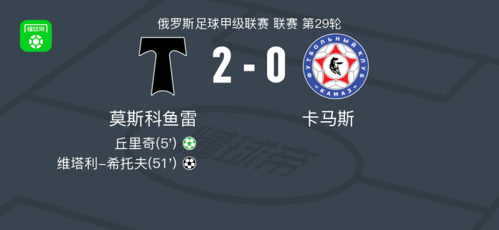 北京时间4月17日俄罗斯足球甲级联赛 联赛 第29轮,莫斯科鱼雷主场对阵卡马斯。莫斯科鱼雷丘里奇破门,维塔利-希托夫破门。最终比分莫斯科鱼雷 2-0 卡马斯。
