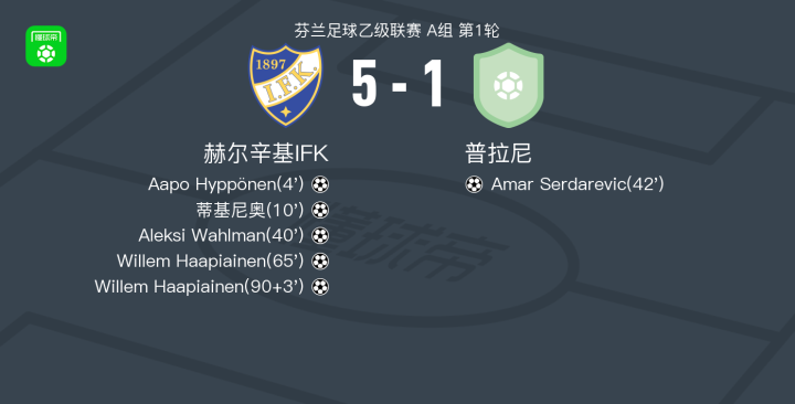 赫尔辛基IFK5-1大胜普拉尼,Willem Haapiainen两球,Aleksi Wahlman建功