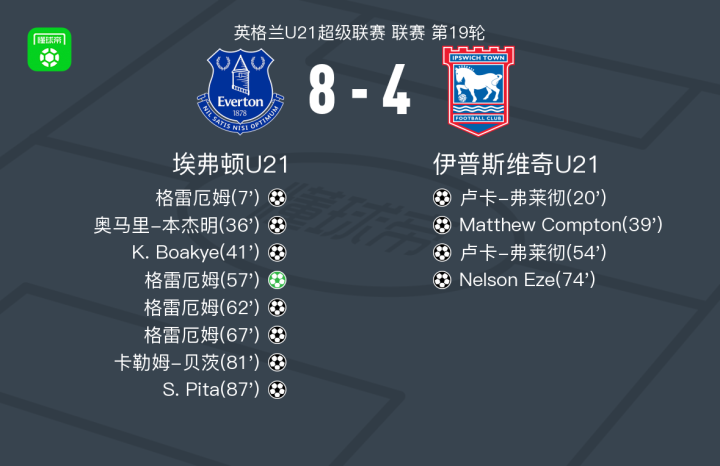 北京时间4月18日英格兰U21超级联赛 联赛 第19轮,埃弗顿U21主场对阵伊普斯维奇U21。埃弗顿U21格雷厄姆大四喜,奥马里-本杰明破门,K. Boakye破门,卡勒姆-贝茨破门,S. Pita破门。伊普斯维奇U21卢卡-弗莱彻梅开二度,Matthew Compton破门,Nelson Eze破门。最终比分埃弗顿U21 8-4 伊普斯维奇U21。