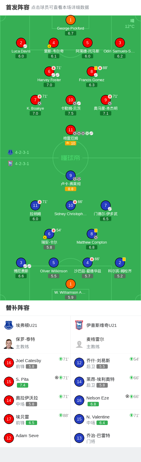埃弗顿U21 8-4大胜伊普斯维奇U21,格雷厄姆大四喜,S. Pita破门