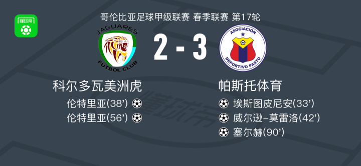北京时间4月18日哥伦比亚足球甲级联赛 春季联赛 第17轮,科尔多瓦美洲虎主场对阵帕斯托体育。科尔多瓦美洲虎伦特里亚梅开二度。帕斯托体育埃斯图皮尼安破门,威尔逊-莫雷洛破门,塞尔赫破门。最终比分科尔多瓦美洲虎 2-3 帕斯托体育。