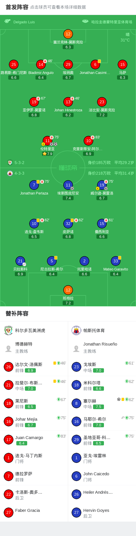 帕斯托体育3-2科尔多瓦美洲虎,塞尔赫破门,威尔逊-莫雷洛建功