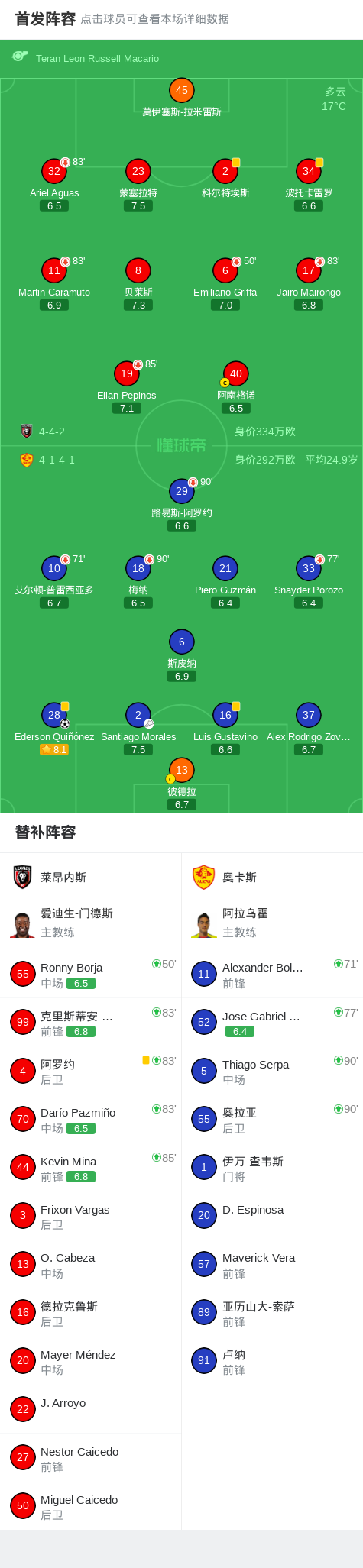 奥卡斯1-0莱昂内斯取厄瓜甲4连胜,Ederson Quiñónez制胜战报bot @懂球帝04-18 07:56北京时间4月18日厄瓜多尔足球甲级联赛 联赛第一阶段 第9轮,莱昂内斯主场对阵奥卡斯。奥卡斯Ederson Quiñónez破门。最终比分莱昂内斯 0-1 奥卡斯。点击查看本场比赛详细数据>>点击查看厄瓜甲完整积分榜>>精彩瞬间第78分钟,奥卡斯球员Santiago Morales助攻Ederson Quiñónez打入一球。 球队阵容 技术统计 展开更多