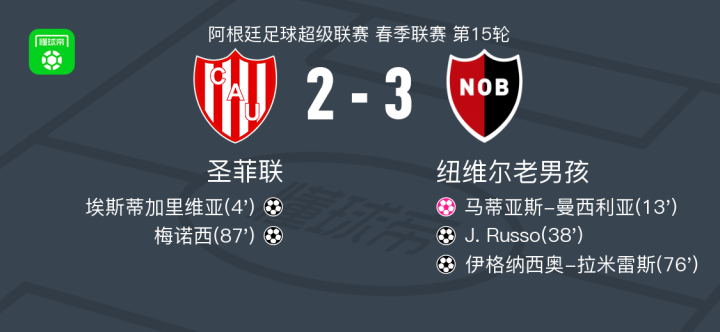 北京时间4月18日阿根廷足球超级联赛 春季联赛 第15轮,圣菲联主场对阵纽维尔老男孩。圣菲联埃斯蒂加里维亚破门,梅诺西破门,马蒂亚斯-曼西利亚自摆乌龙。纽维尔老男孩J. Russo破门,伊格纳西奥-拉米雷斯破门。最终比分圣菲联 2-3 纽维尔老男孩。