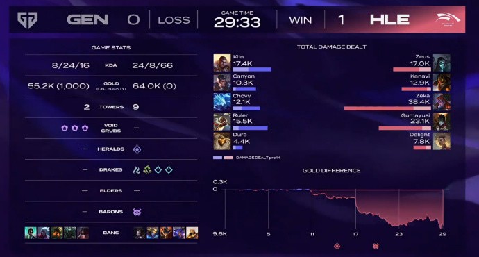 GEN下路对线拿到了一血。但本局Kanavi蔚节奏非常频繁,在三路都有所收获,不过GEN在20分钟就控下了三条小龙,双方经济差并没有拉开。关键一波虽然GEN冲死了Gumayusi芸阿娜,但是Zeka永恩补足了后续输出,HLE打出2换4阻止对手拿到龙魂。HLE拿到大龙后下路被逮到人少的时机,GEN打出1换3收下龙魂,下一波Zeka永恩封尘绝念斩命中Ruler,局势再次逆转,HLE中路再次打出0换3后一波结束比赛!