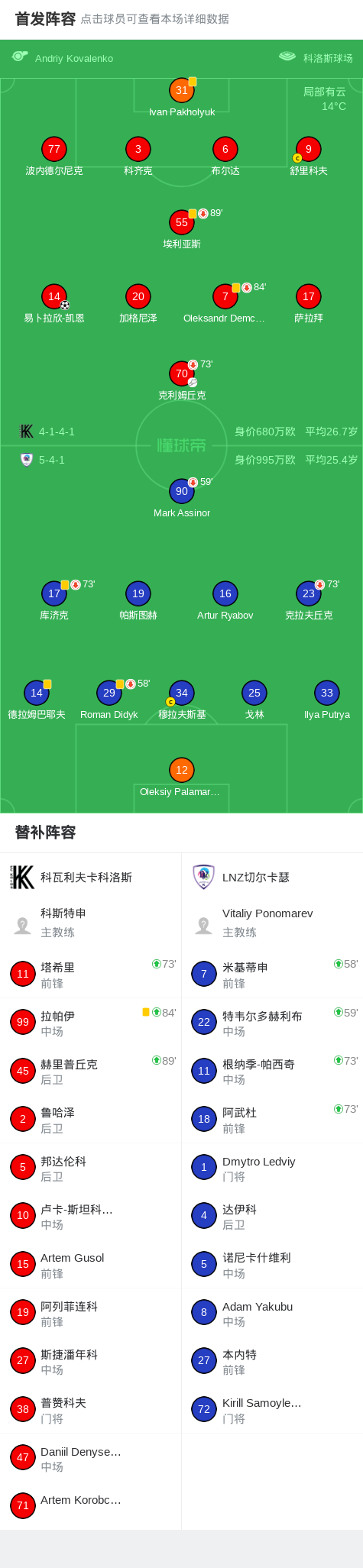第7分钟,科瓦利夫卡科洛斯球员克利姆丘克助攻易卜拉欣-凯恩打入一球。