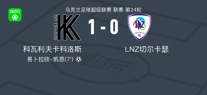 北京时间4月18日乌克兰足球超级联赛 联赛 第24轮,科瓦利夫卡科洛斯主场对阵LNZ切尔卡瑟。科瓦利夫卡科洛斯易卜拉欣-凯恩破门。最终比分科瓦利夫卡科洛斯 1-0 LNZ切尔卡瑟。