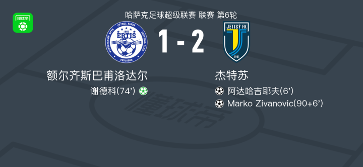 北京时间4月18日哈萨克足球超级联赛 联赛 第6轮,额尔齐斯巴甫洛达尔主场对阵杰特苏。额尔齐斯巴甫洛达尔谢德科破门。杰特苏阿达哈吉耶夫破门,Marko Zivanovic破门。最终比分额尔齐斯巴甫洛达尔 1-2 杰特苏。