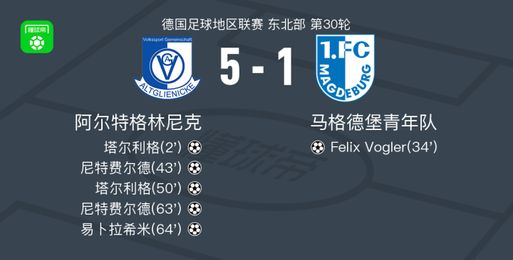 北京时间4月18日德国足球地区联赛 东北部 第30轮,阿尔特格林尼克主场对阵马格德堡青年队。阿尔特格林尼克塔尔利格梅开二度,尼特费尔德梅开二度,易卜拉希米破门。马格德堡青年队Felix Vogler破门。最终比分阿尔特格林尼克 5-1 马格德堡青年队。