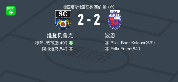 北京时间4月18日德国足球地区联赛 西部 第30轮,维登贝鲁克主场对阵波恩。维登贝鲁克穆萨-敦布亚破门,阿梅迪克破门。波恩Bilal-Badr Ksiouar破门,Felix Erken破门。最终比分维登贝鲁克 2-2 波恩。