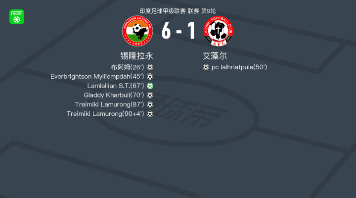 北京时间4月18日印度足球甲级联赛 联赛 第9轮,锡隆拉永主场对阵艾藻尔。锡隆拉永布阿姆破门,Everbrightson Mylliempdah破门,Gladdy Kharbuli破门,Treimiki Lamurong梅开二度,Lamlallian S.T.破门。艾藻尔pc lalhriatpuia破门。最终比分锡隆拉永 6-1 艾藻尔。
