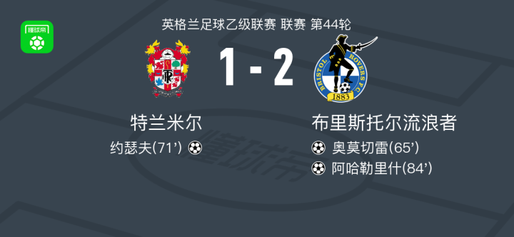 北京时间4月18日英格兰足球乙级联赛 联赛 第44轮,特兰米尔主场对阵布里斯托尔流浪者。特兰米尔约瑟夫破门。布里斯托尔流浪者奥莫切雷破门,阿哈勒里什破门。最终比分特兰米尔 1-2 布里斯托尔流浪者。