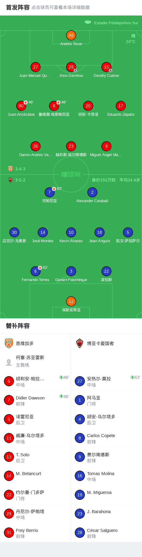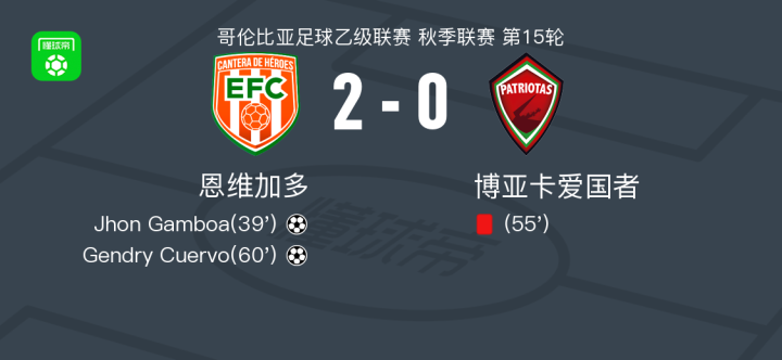 恩维加多2-0博亚卡爱国者,Jhon Gamboa建功,Gendry Cuervo锦上添花