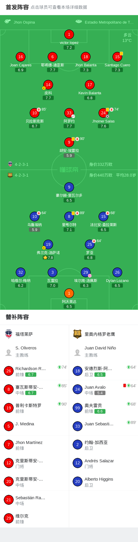 北京时间4月19日哥伦比亚足球甲级联赛 春季联赛 第17轮,福塔莱萨主场对阵里奥内格罗老鹰。福塔莱萨Jhoiner Salas破门。里奥内格罗老鹰埃尔南-洛佩斯自摆乌龙。最终比分福塔莱萨 2-0 里奥内格罗老鹰。