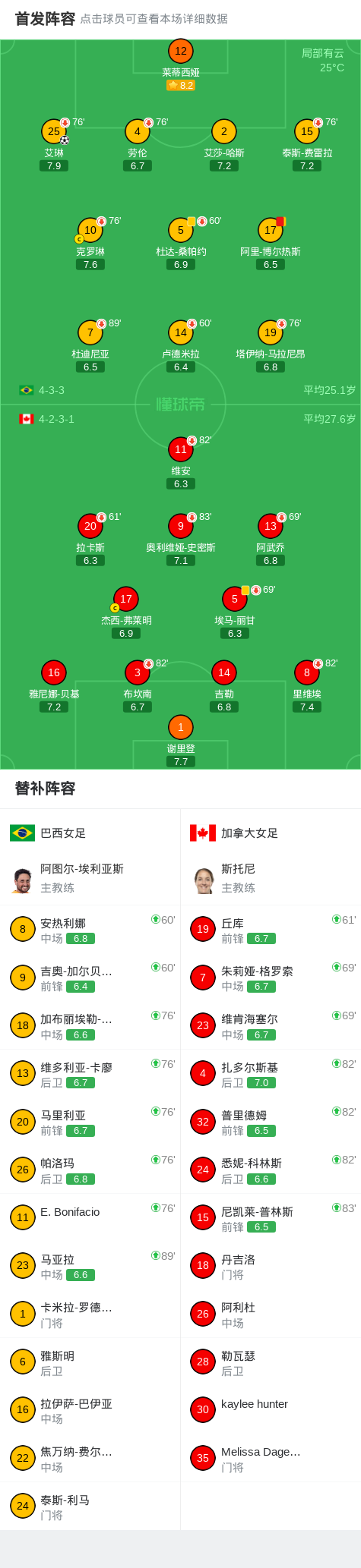 北京时间4月19日FIFA女系列赛 巴西赛区 第3轮,巴西女足对阵加拿大女足。巴西女足艾琳破门。最终比分巴西女足 1-0 加拿大女足。