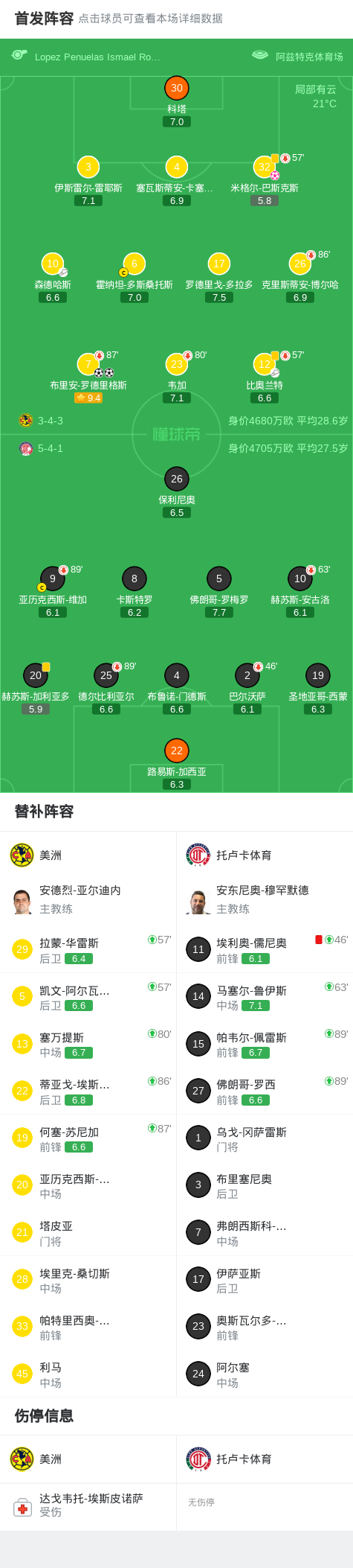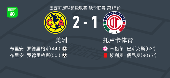 北京时间4月19日墨西哥足球超级联赛 秋季联赛 第15轮,美洲主场对阵托卢卡体育。美洲布里安-罗德里格斯梅开二度,米格尔-巴斯克斯自摆乌龙。最终比分美洲 2-1 托卢卡体育。